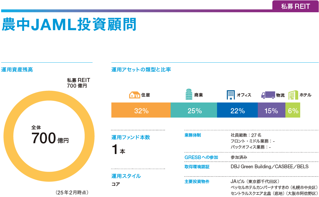 農中JAML投資顧問(NJIA) は、農林中央金庫(農中)とJA三井リース(JAML)をスポンサーとする不動産AM会社。私募REIT「農中JAMLリート(NJPR)」を運用している。