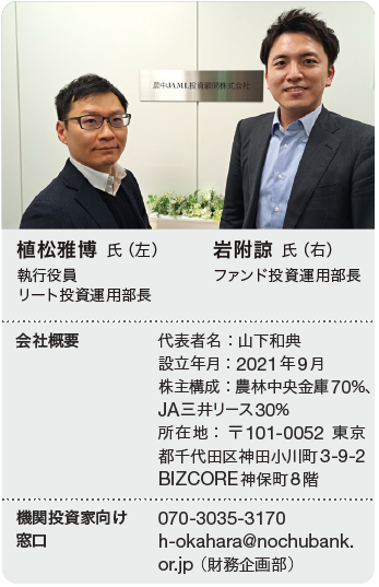 投資対象は私募REITでは取得しづらいものを狙う。具体的には1棟100億円以上の大型物件、冷凍冷蔵倉庫やデータセンターなど設備の償却負担が大きい物件などだ。「幅広いアセットタイプを検討。私募REIT同様に食農関連は注力テーマの一つであり、冷凍冷蔵倉庫も需給バランスを鑑みれば有望。農中とJAMLがスポンサーの当社としてはテナントニーズを把握しやすく、AMとしてのユニークさも打ち出せる」(ファンド投資運用部長の岩附諒氏)。