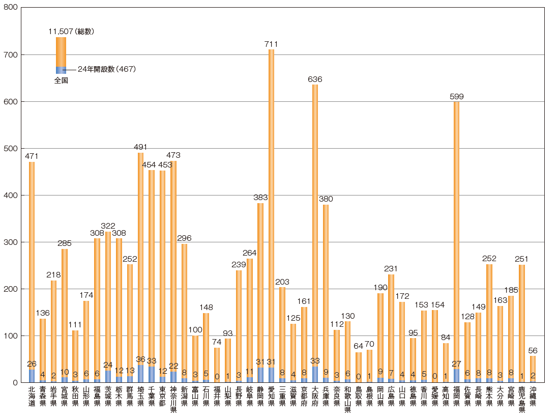 図表は、2024年の全国の葬祭会館新設動向を示したものである。それによると、編集部で確認できた24年の会館新設数は467か所である(2023年は334か所)。編集部では本誌創刊時の1996年から全国の会館データを集計しているが、この467という数字は約30年間で最も多い新設数ではないかと思われる。その結果、全国の会館総数は1万1,507か所となった。