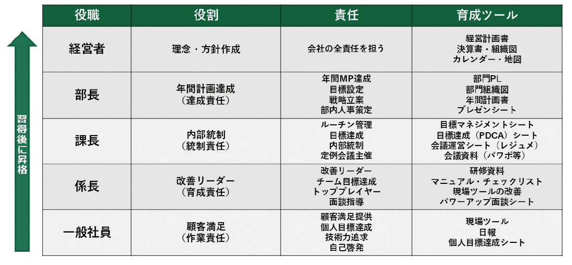 同じように、社長以外の役職の責任、ツールを整理すると、図表のようになります。こうすると、教育の責任も明確になります。この場合、係長が現場教育の責任者であり、課長・部長は係長に教え方を伝える責任者になります。