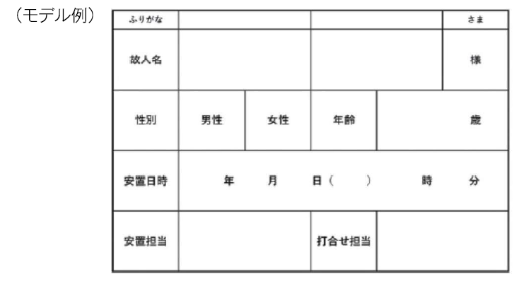 柩に付ける名札に、故人の名前・性別・年齢等の個人識別情報に加えて、安置日時、安置担当者、納棺日、湯灌や着替え、メイクの有無、通夜や告別式の日時を記載することで、遺体情報の個別化を図っている例がある。