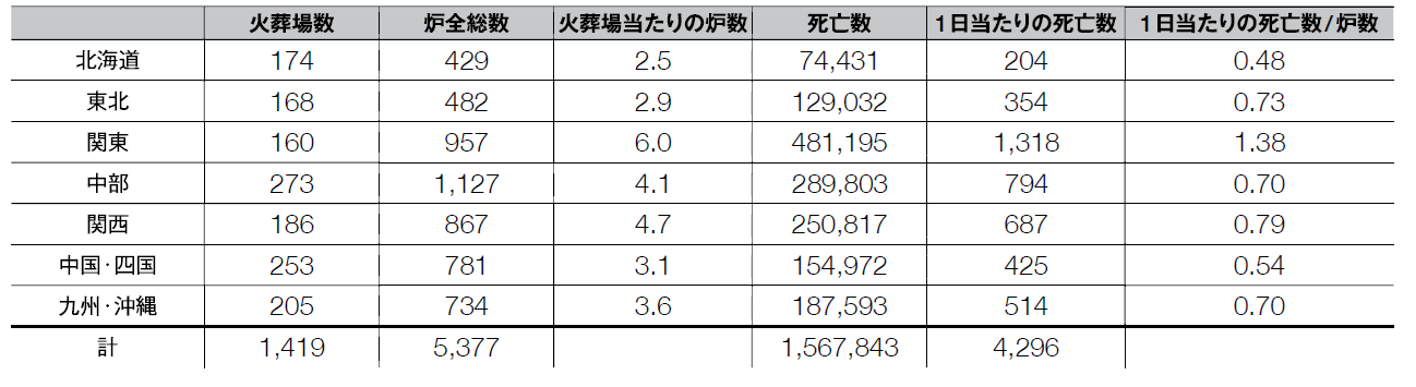 図表1に、全国地域別の火葬場の炉数と死亡数の比較を示す。22年の段階で、すでに関東地方は他地方に比べ、炉l基当たり2倍以上の死亡数があり、特に1都3