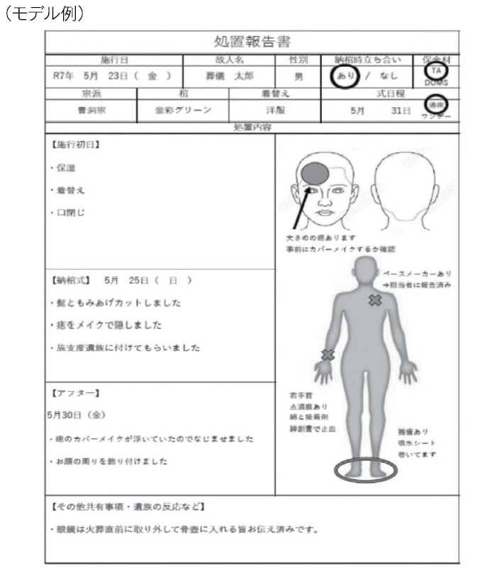 遺体にメイクや処置を行なったことに加え、その実施日・故人名(喪家)・性別・納棺時の立会い有無、使用保全剤の有無(種別)、宗派(宗教)、棺種別、式日程の情報を記載し、遺体の傷や体液漏出口、感染情報等の個別情報を図示して共有している例がある。