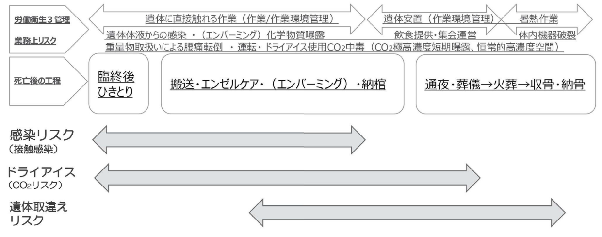 こうした状況を踏まえ、本研究班として葬儀や遺体取扱い事業における労働衛生上の課題を整理したのが図表2である。主に3点、すなわち、遺体からの感染リスク