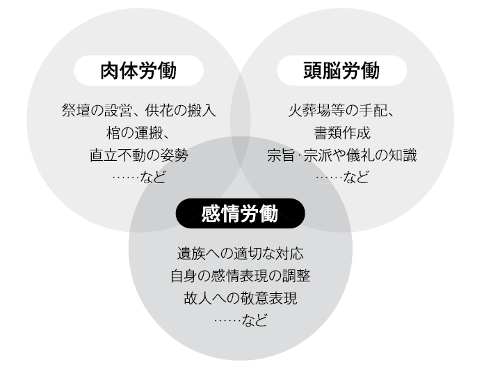 言い換えれば、顧客に対して「気を遣う」ことが仕事の大きな要素になっている労働のことです。葬祭業には、肉体労働、頭脳労働、そして感情労働に当てはまるさまざまな業