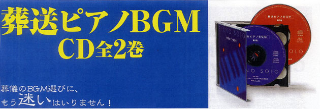 | 好評発売中!! 全曲オリジナル作品。進行の場面を想定した20曲を生演奏で収録! 葬送ピアノBGM CD 全2巻 ■CD2枚組(第1巻:[64:01]、第2巻:[61:08]) ■定価:本体34,000円+税 ■2003年4月刊行■ 汎用性の高いピアノソロのオリジナルメロディは、個人葬から社葬・お別れ会までスタイルを問わず、司会場所も会館・寺院・自宅・公共施設等まであらゆる式典で利用可能です。(作・編曲/MCプロデュース 井手一男・加藤直美) |