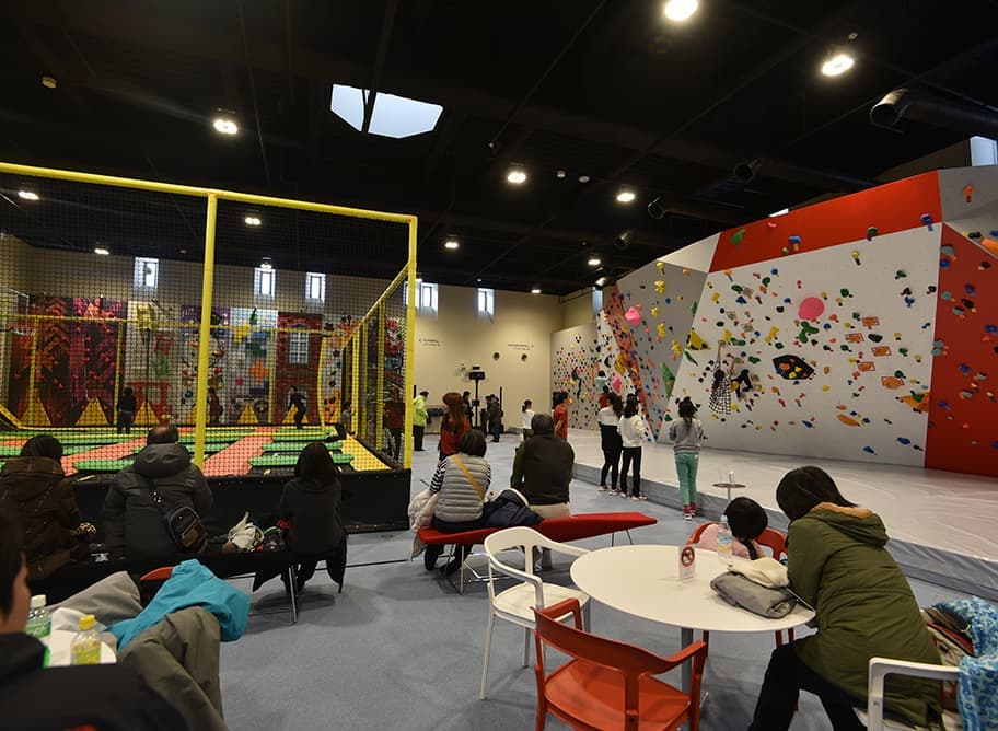 屋内アクティビティにはボルダリングやトランポリンなど4つのコンテンツを導入。ボルダリングのウォールの高さは4.5m、ルート数89と本格仕様だ。通常のボルダリングだけでなく、プロジェクションマッピングとクライミングを融合させたデジタルアクティビティ「ワンダーウォール」も常設している。利用料金は大人2000円、子ども(4歳~小学生まで)1000円。