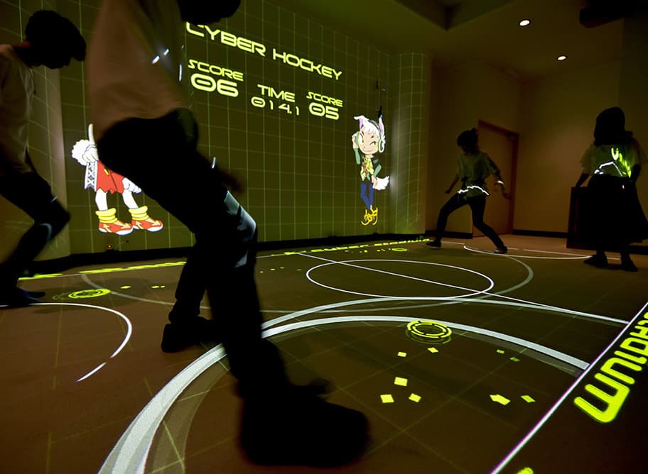 ホテル業界初の導入となったのが次世代型体感型アトラクション「サイバースタジアム」だ。センサー技術とプロジェクションマッピング技術を活用したデジタルアトラクションで、ホッケーゲームの「サイバーホッケー」や、ブロック崩しの「サイバーブロック」、迫ってくる音符を踏んでいく「サイバーリズム」、クイズ形式の対戦型教育ゲーム「サイバーモンジャ」など4種のコンテンツが導入されている。