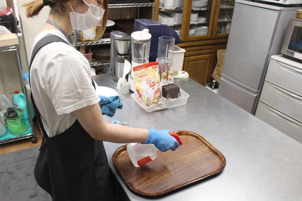 スタッフが常に利用できるようにバックヤードの作業スペースに手袋と消毒液を常備