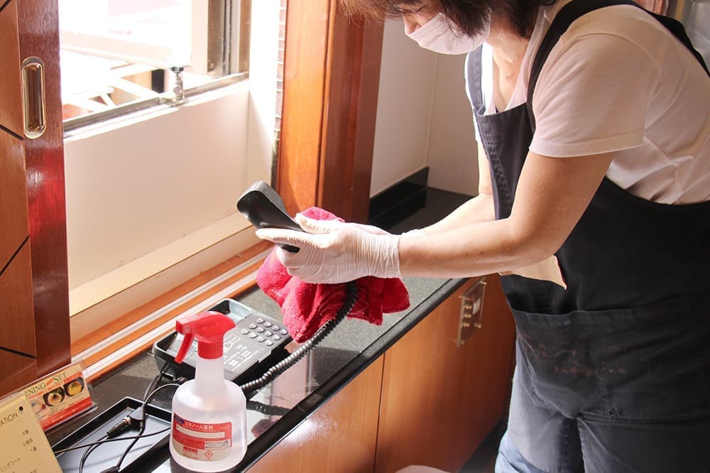 ベッドサイドの電話機など、利用客が直接手を触れる部分は、清掃時に必ずアルコールで除菌する