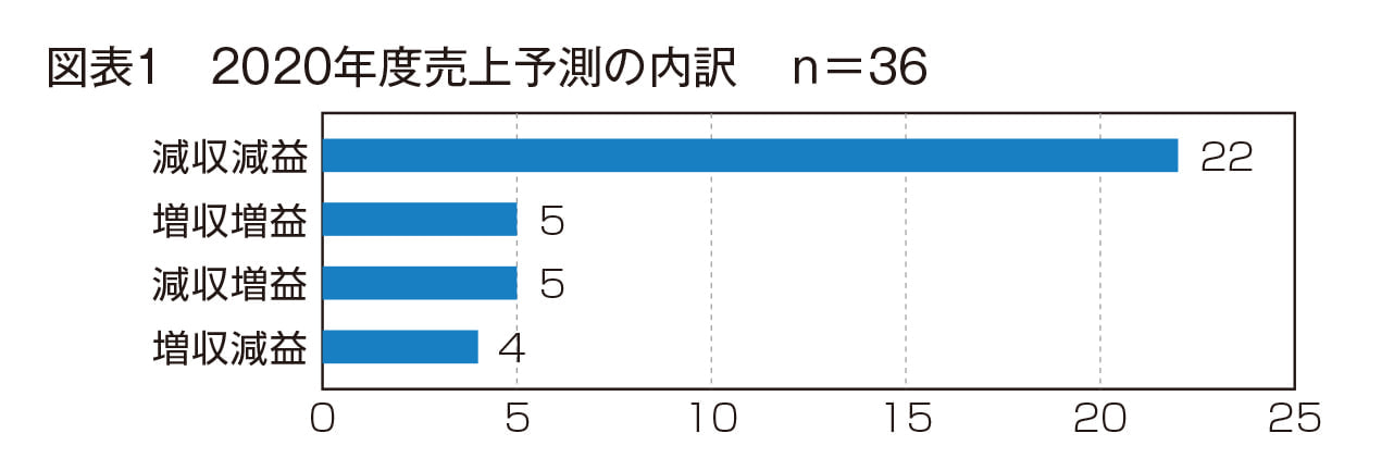 コロナ禍の2020年度(20年4月~21年3月)売上予測の内訳では、36社の回答で、22社が「減収減益」と回答(図表1)。平均数値は「対前年比92%」となった。