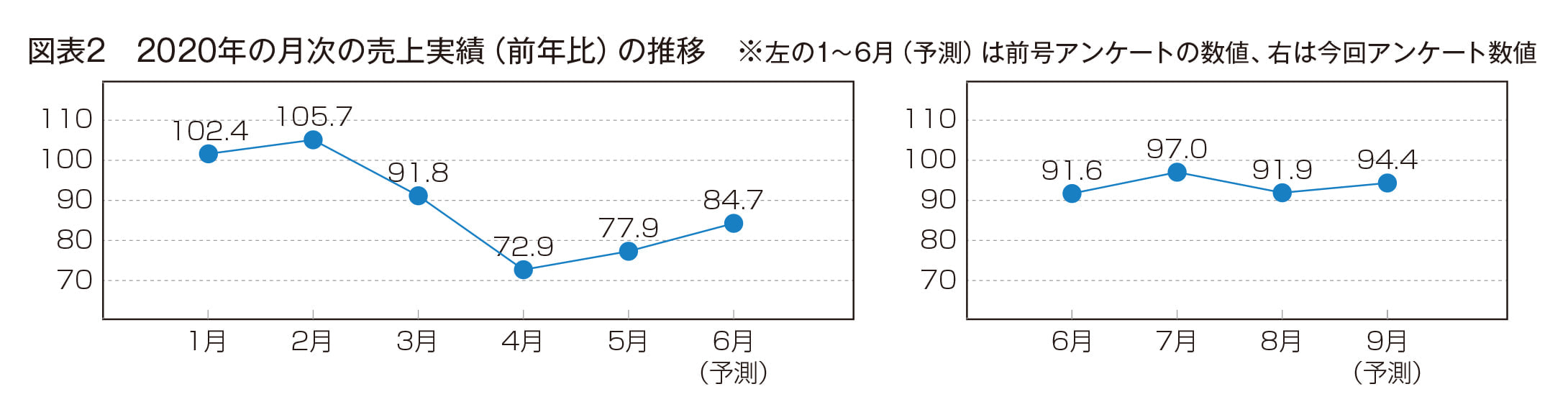 一方、月別の売上状況(対前年実績)は、6月91.6%、7月97%、8月91.9%、9月(予測)94.4%と、「コロナ禍」のなかで9割台の数値を維持している(図表2)。