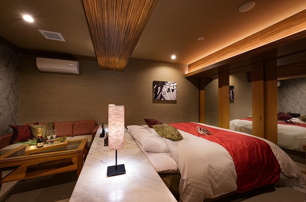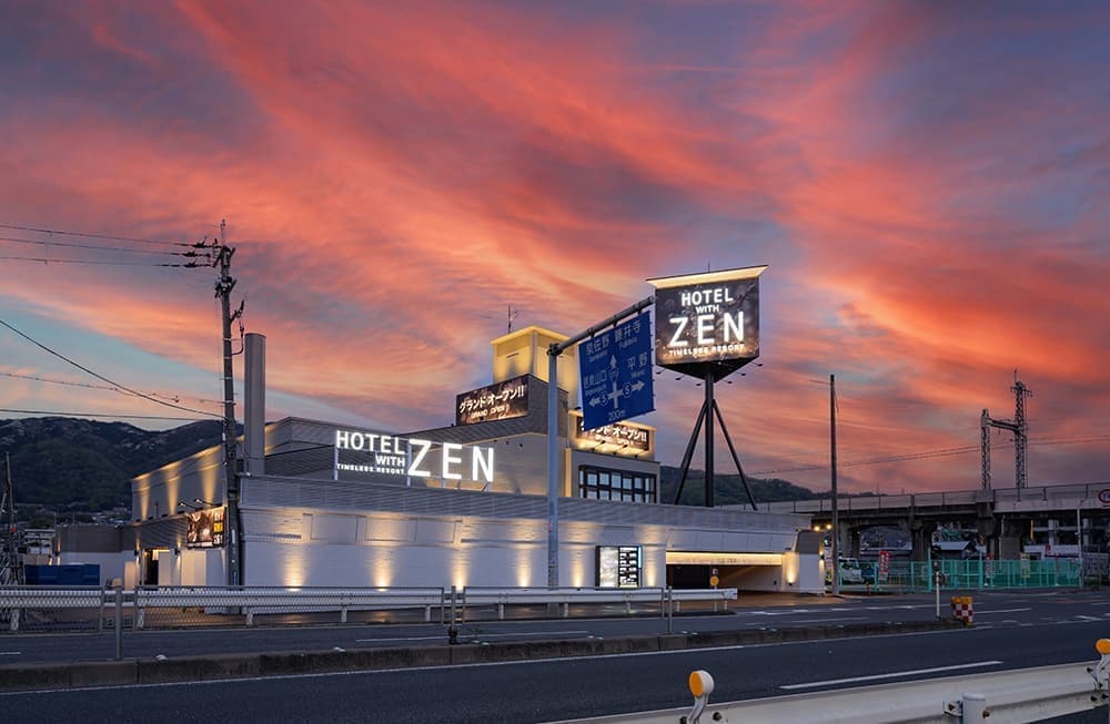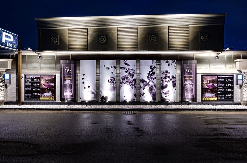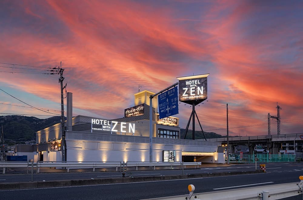 大阪外環状線道路、国道170号線沿いの連棟式ホテルを、シリーズ店舗『ZEN』としてリニューアル。和モダンコンセプトであるブランド店舗の認知を高めるべく、外観は視認性の高いサインポールの改良を主に、明確な行灯サインと間接照明笠木でしっかりとした認識を与えた。建物はできる限り華飾要素を取り払い、カラー、ライティング、グラフィックパネルで調和を整え、全体的にスタイリッシュな印象を与える表現にこだわった。また、各エントランスに和暖簾を配備し連棟式特有のプライバシー配慮を兼ねつつ、別空間への興味心向上を狙った。一方、客室は、大型TV、サウンドバー導入などの機材面更新と、地域ユーザーへの安心感を意識しながらそれぞれ新鮮な和洋折中のインテリアスタイルで上質な雰囲気にまとめた。