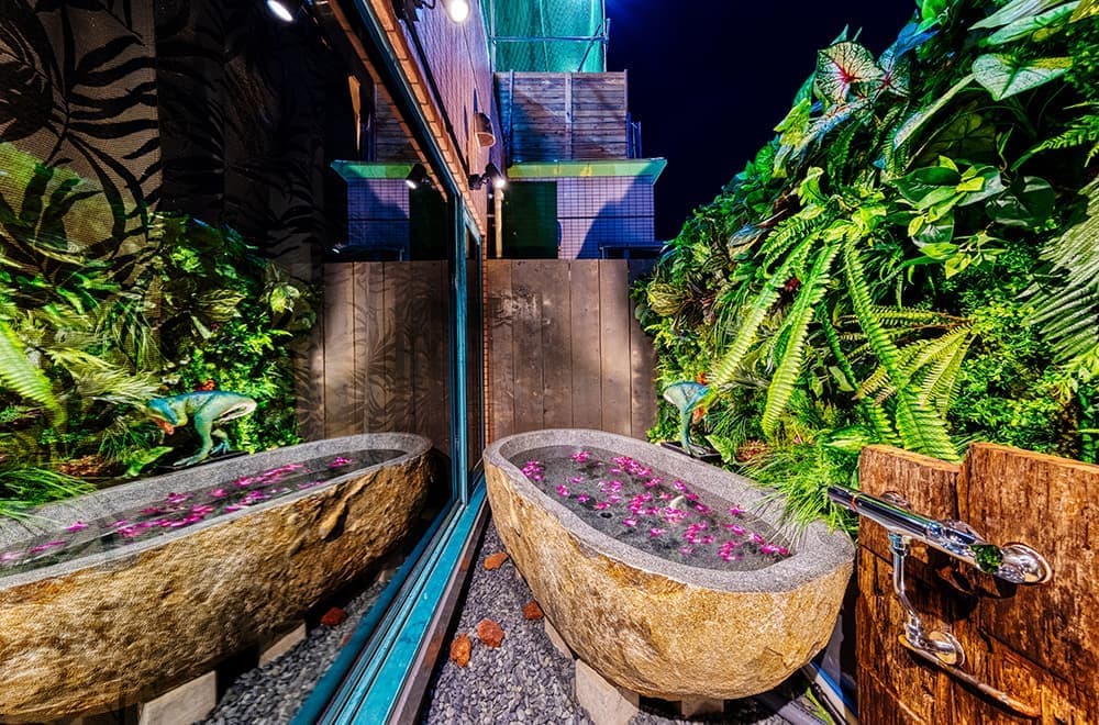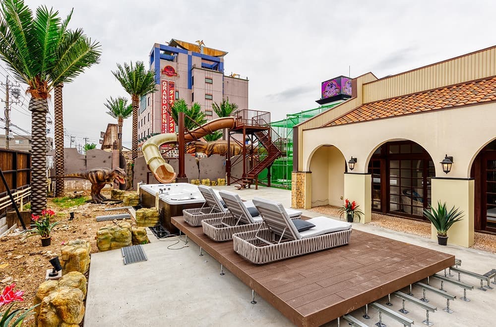 ㈱Best Delight Groupは、岐阜市内の隣接する2ホテルの運営受託にあたり、恐竜をテーマとした「HOTEL ARTIA DINOSAUR」(38室・新法ホテル)、「HOTEL ARTIA DINOSAUR SENSUAL」(17室・4号営業ホテル)として去る7月16日にリニューアルグランドオープン。隣接するカフェを、ウォータースライダーやプールなどを付帯した「ヴィラ」として開設するなど、高インパクトの実現と、ピンポイントのコスト投資によるローコストリニューアルを目指し、老朽化ホテルを話題性の高いエンターテインメントホテルへと再生した。
