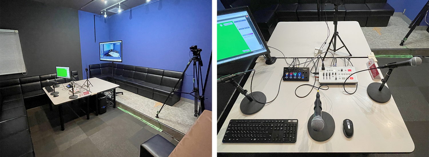 ㈱エクシングが開発した、カラオケの人気4万曲が“許諾不要”で配信できる「カラオケJOYSOUND for STREAMER」を搭載したPCと、最新の撮影・配信機材が揃えられ、①配信仲間との「コラボ配信」、②仲間と楽しむ「トーク配信」、ゲームを持ち込んでの「ゲーム実況配信」など、さまざまな活用が想定されている。
