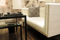 そんな料理を楽しむ時間を演出するソファのクォリティをはじめ、大小組み合わせのテーブルやバランスも秀逸。ベッドヘッドにはゴテゴテしたスイッチ類というイメージのレジャーホテルであるが、こちらのスッキリしたベッド周りは新たなアプローチといえよう。