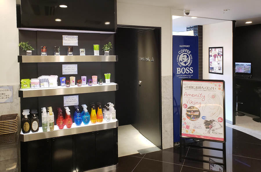 大きく開口したフロントが印象的。明るいロビースペースには“選べるシャンプー”や“雑誌”といったレジャーホテルの要素があるアイテムから、パソコンや電子レンジなどビジネスホテルでお馴染みのアイテムも並ぶ。