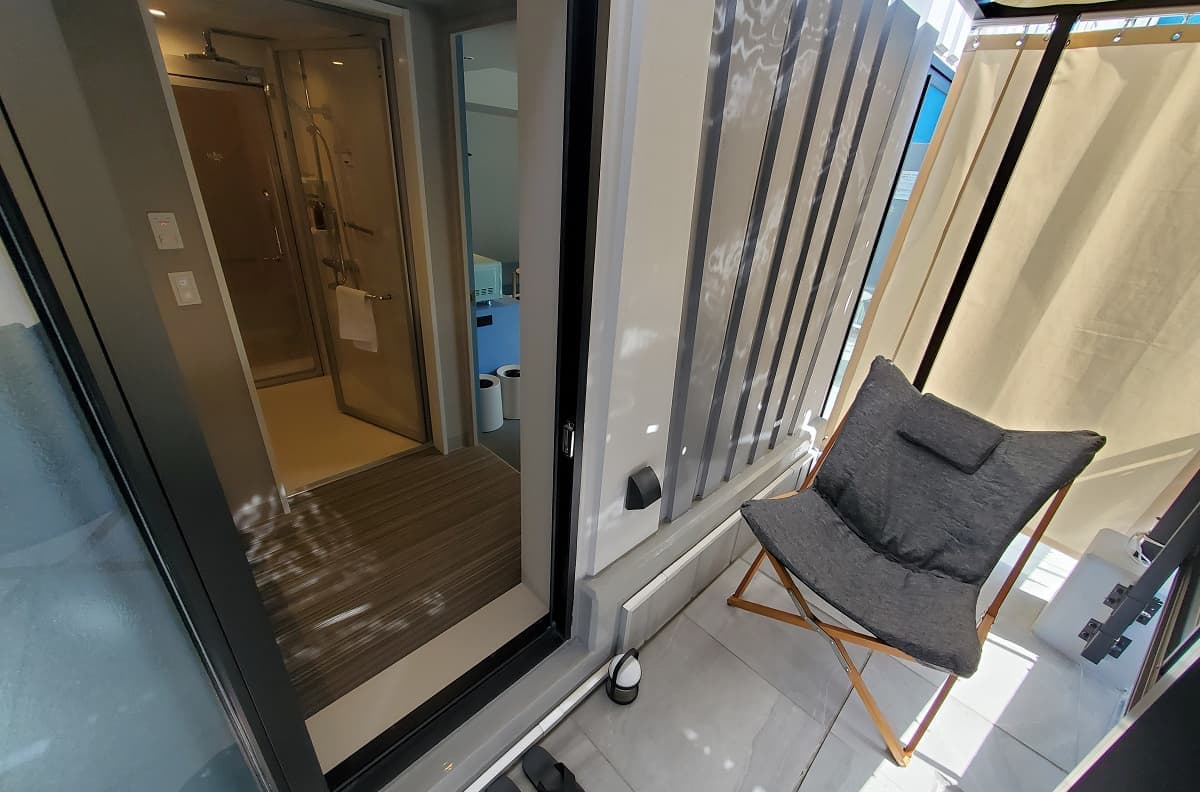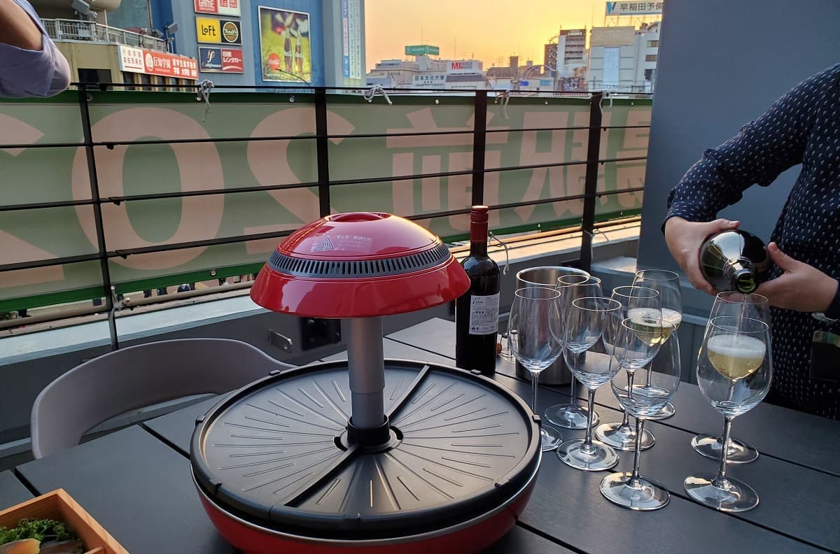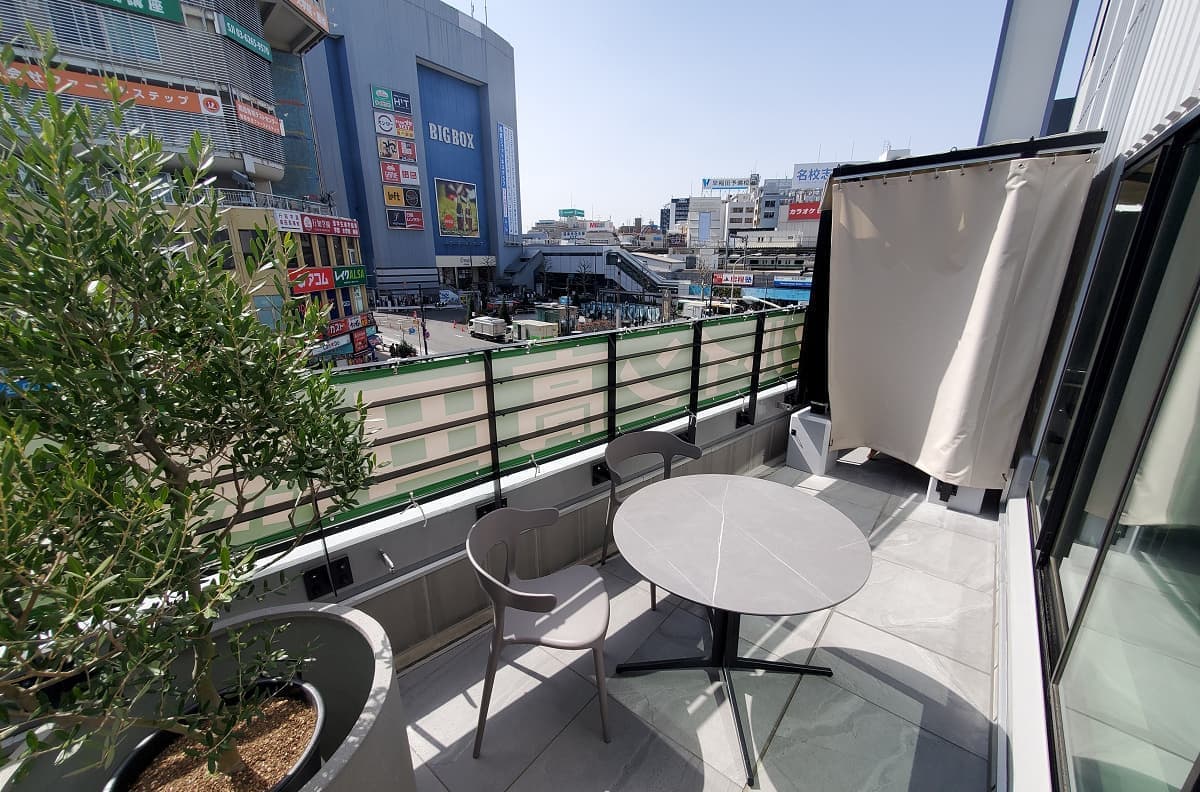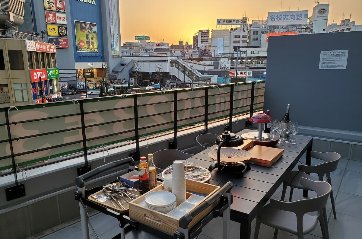サウナとセットともいえる外気浴スペースも設置。BABAスイートにはそれぞれテラスがあり、サウナ→水風呂からそのまま出られる動線をとった。周囲が囲われているので、裸で外気浴ができる開放感が魅力だ。高田馬場駅のホームメロディ“鉄腕アトム”を聞きながらの外気浴は最高である。BABAスイートのみテラスでBBQ(1人5,000円~)も実現。上のフロアにも迷惑がかからないよう無煙ロースターを用いた。JR高田馬場駅前ロータリーを目の前にBBQパーティーが開けるのは最高だが、何よりサウナ~水風呂~ととのいからBBQへ直行できるという個人的に夢だったことが実現できた。準備と片付けはスタッフが担当するのでゲストは楽しむだけ。