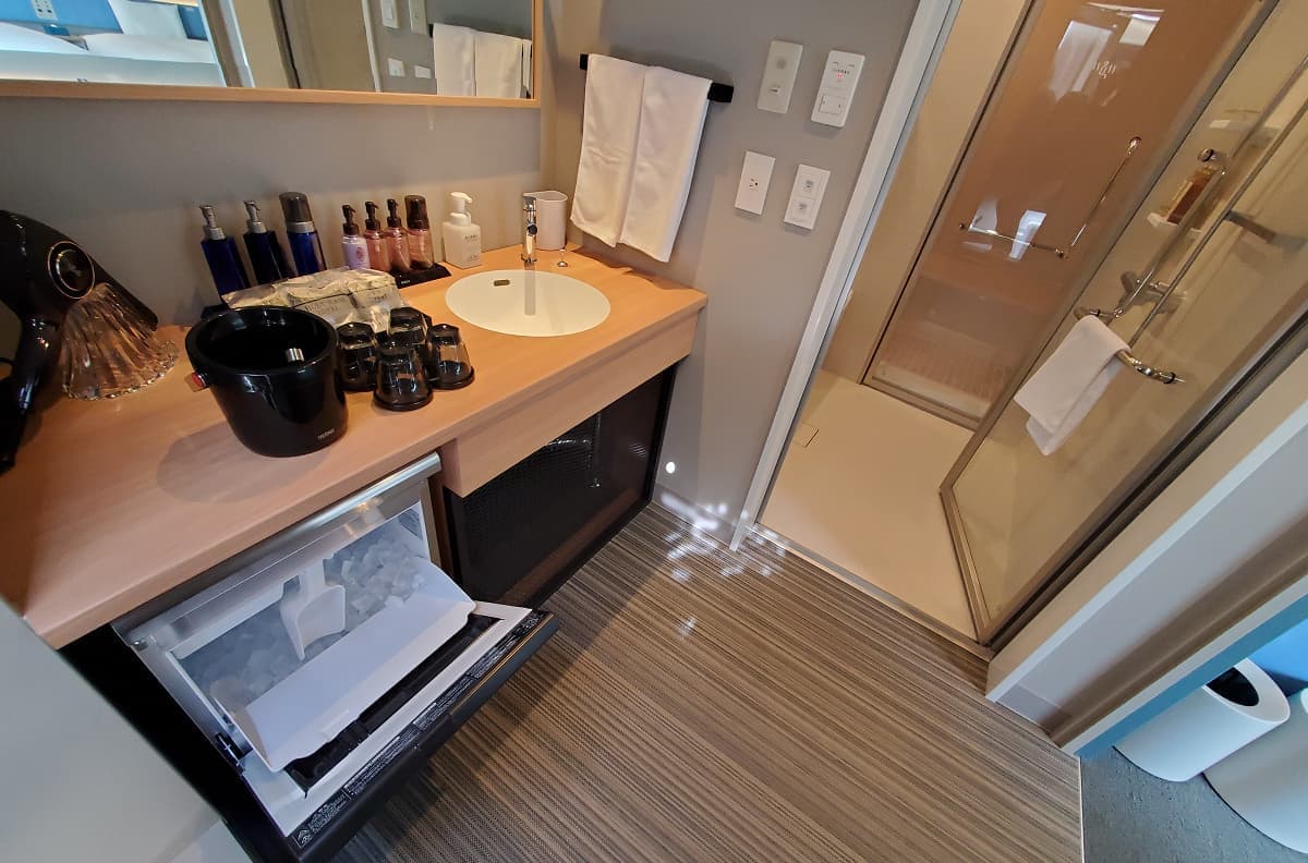 そこで今回選んだのが最高峰のスチームサウナ。レジャーホテルで導入されているのを体感しそのパワーに満足してきたものと同じタイプだ。BABAスイートのサウナブースサイズであれば、スイッチ・オンから5分後にスチームが出て15分で蒸気はMAXになる。このスチームサウナの威力は相当で肌も潤う女性にもうれしいサウナだ。バスタブを用いた冷水浴についても、2室のプライベートサウナということで高額なチラー装置は念頭に無く、とはいえ低温を実現すべく洗面所に業界初となるだろう業務用の製氷機を設置した。もちろんドリンクにも利用できる。浴槽にテレビを設置したのもレジャーホテルの要素を意識した。