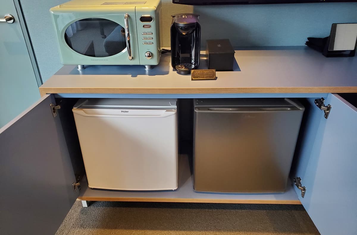 客室の冷蔵庫には無料の赤と白のワイン、スパークリング、ビールも冷やされている。小腹が空いたときにうれしいカップスープも置いた。冷蔵庫の横には冷凍庫も設置、冷蔵庫と冷凍庫の扉が観音開きのように開くことにも気遣った。
