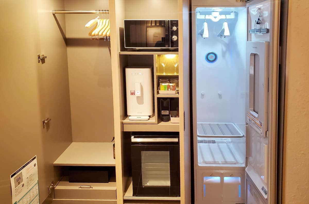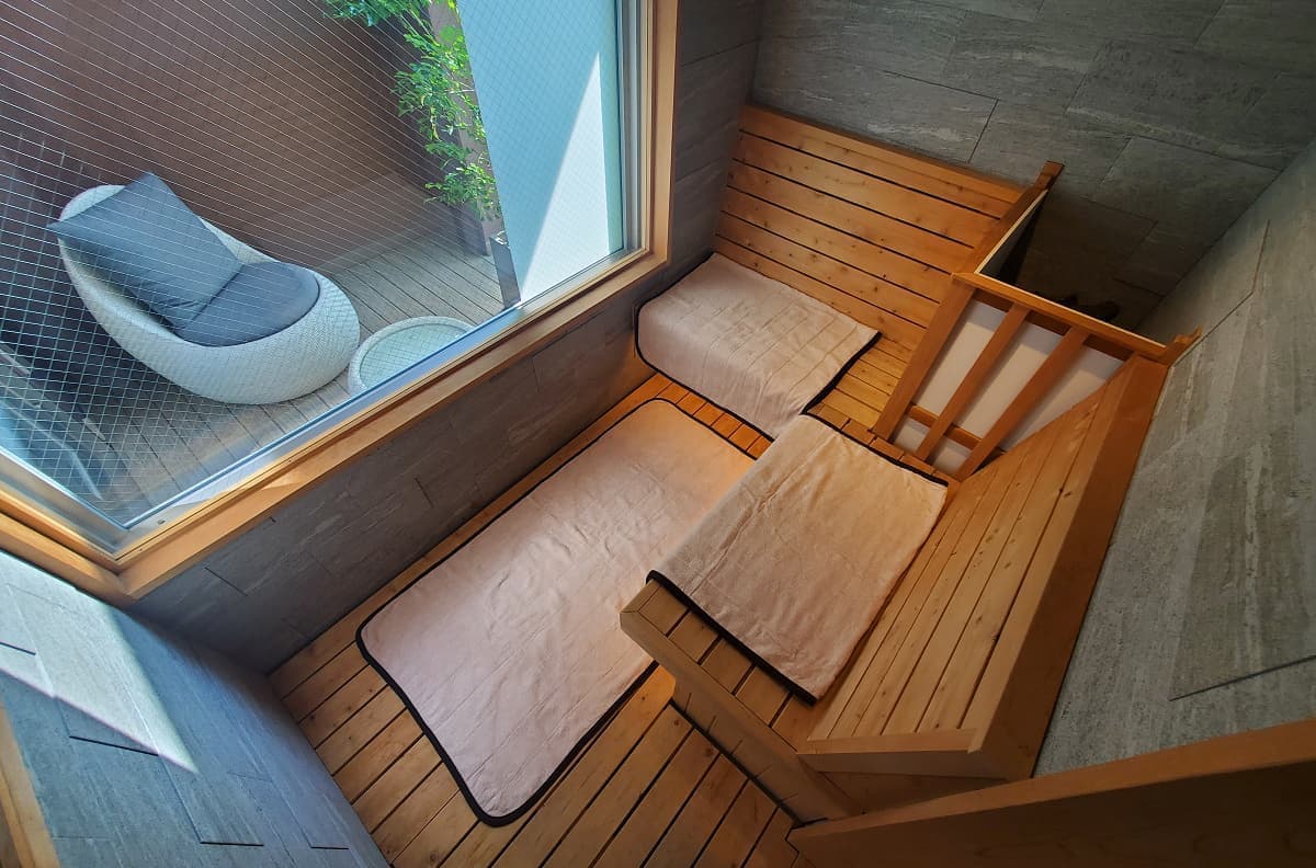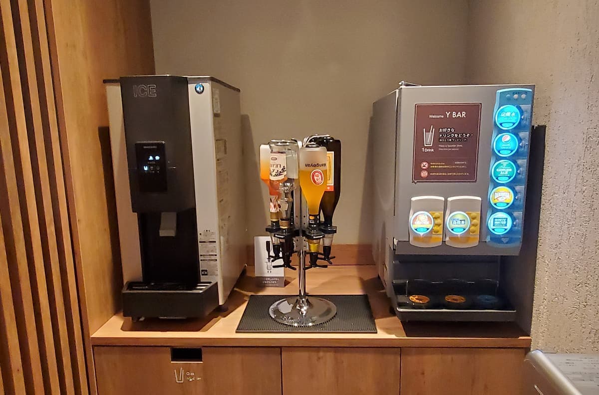 ホテルのご自慢が「ミラージュスイート」「クラウンスイート」だ。ミラージュスイートは、繁華街を俯瞰するテラスを備え、露天風呂、オーバーヘッドシャワー、水中照明、ブロア機能が付いたストーンバスの内風呂を完備。クラウンスイートは、セルフローリュウが愉しめる本格的なドライサウナを設置、ととのいスペースもしっかり確保されたサウナー垂涎の客室だ。そんな洗練されたホテルの各所に息づくのがオーナーのゲスト目線。ウエイティングスペースにはビールから各種リキュールの並んだセルフBAR、チェックイン機の横にはひと目で客室の設備がわかる掲示もある。