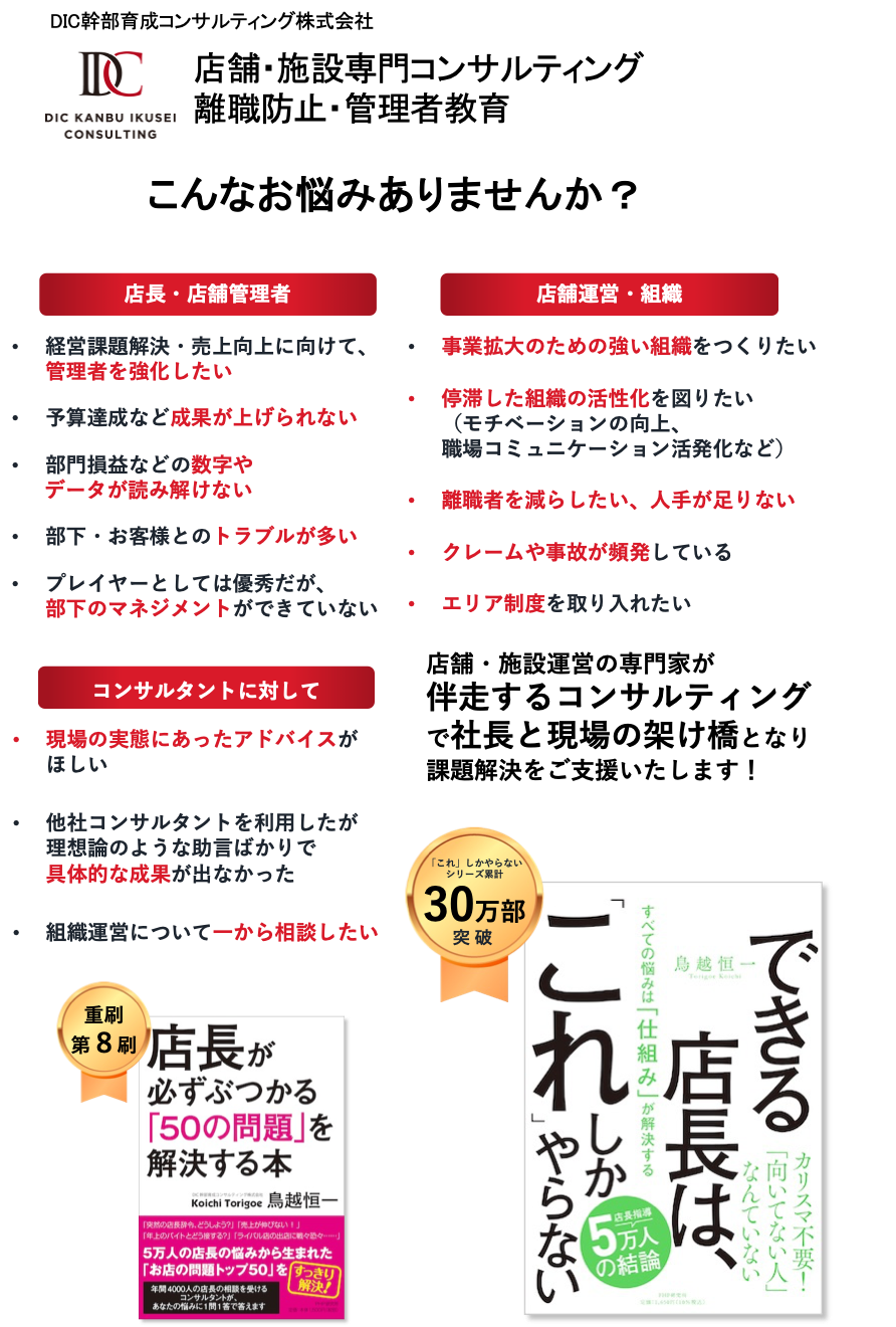 当社は店舗ビジネスに特化したコンサルティング会社です。店舗・施設で発生する課題に対して、現場で使える効果的な仕組みを構築いたします。離職防止、スタッフ育成の制度に特に強みがあります。店長向けの専門書も日本最多級に執筆しております。店長が必ずぶつかる50の問題を解決する本(2015年PHP研究所)、できる店長はこれしかやらない(2021年PHP研究所)、プロ店長最強の仕事術(2017年日本経済新聞出版社)