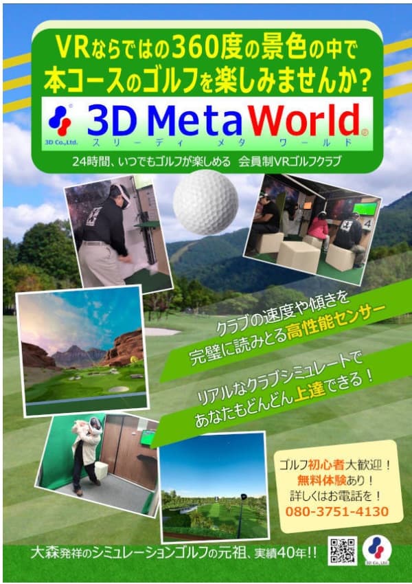 国内におけるシミュレーションゴルフのパイオニアである㈱スリーディは、新たにゴーグルタイプのバーチャルゴルフを開発した。専用ゴーグルと専用クラブでラウンドプレイが可能のため、従来の室内ゴルフのようなスペースを確保することなく、防音工事の必要もない。
