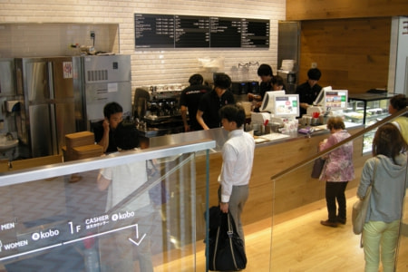 3フロアからなる店内は無料Wi-Fi環境を完備し、1階全席と2階カウンター全席に「Kobo Arc7HD」を配置。また全席にコンセントを備えたほか、主要モバイルの充電器の貸出しを行なうなどITステーションとしての機能も併せ持つ。このほか、楽天カード、楽天銀行、楽天証券などのファイナンスサービスをはじめとする楽天グループの多様なサービスについての質問を受けるコンシェルジェを配置している。