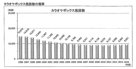 それによると、2014年度の全国のカラオケ施設数は9,551軒(前年比188軒プラス)で、平均売上げは1か月1室25万円となった(図表1)。
