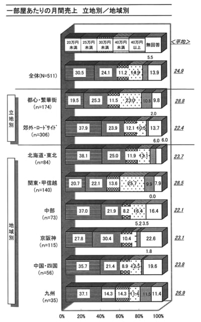立地別でみると、都心・繁華街では20万円未満が20%なのに対して、郊外・ロードサイドは38%と2倍近くになり、平均売上げが都心・繁華街が29万円であるのに対して、郊外・ロードサイドは22万円となっている(図表2)。
