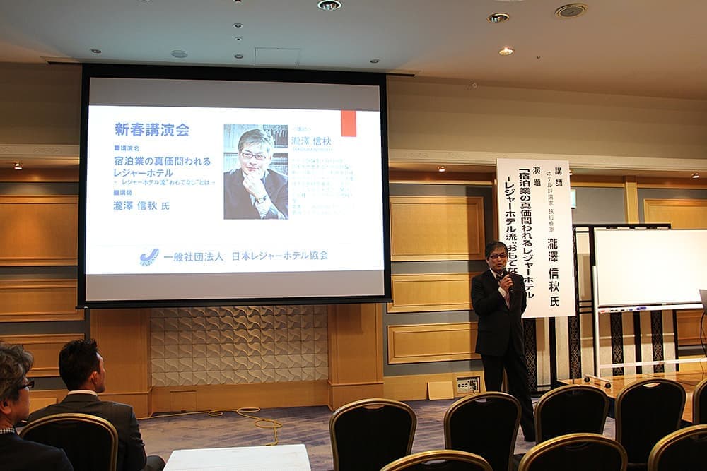 新春講演会は、ホテル評論家・瀧澤信秋氏が登壇し、「宿泊業の真価問われるレジャーホテル-レジャーホテル流“おもてなし”とは―」のテーマのもとに1時間半にわたり講演。205名が受講した。