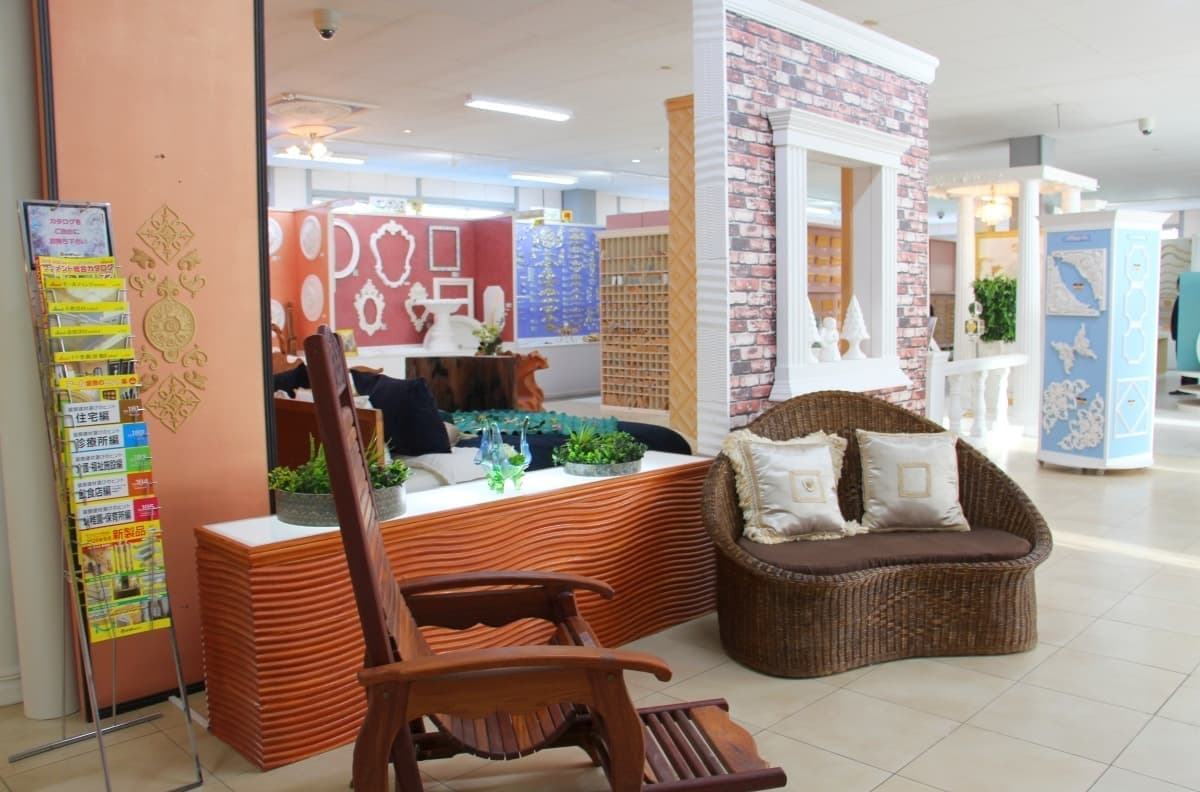 ショールームでは、同社の代表的な木製モールディングをはじめ、人気の樹脂製装飾材、階段廻りの装飾部材などを多数ラインナップする。また、ラオスの木工家具・工芸品など日本にはない新しい商品も展示。「華飾文化を創造する」という同社のテーマに、あらゆる空間に豪華さとうるおいを創出する商品を発信していく。