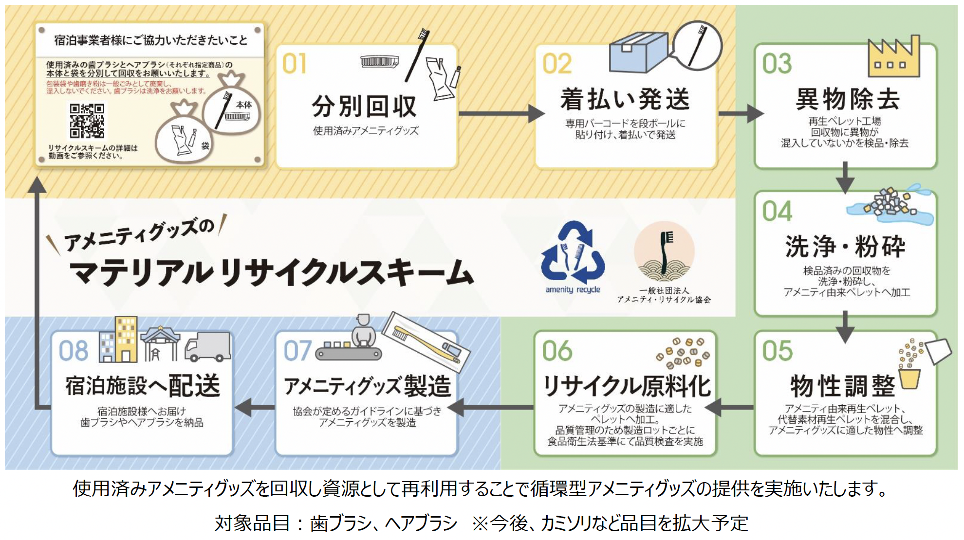 同協会設立の背景には、2022年4月に施行したプラスチック資源循環促進法により、宿泊事業者は歯ブラシ、ヘアブラシなど12品目の特定プラスチック使用製品の使用合理化、廃プラスチックごみ排出の抑制、使用済みプラスチックを資源として再利用するためのリサイクル推進が求められていることがある。アメニティグッズに関しては従来、各社ごとに複数の原料を使用した製品を販売しており、リサイクルしにくいという課題があった。同協会では製品ガイドラインを含む適正なマテリアルリサイクルを通じて、アメニティグッズの品質向上と宿泊産業全体の発展を図り、マテリアルリサイクルを行なう宿泊施設を支援していくという。