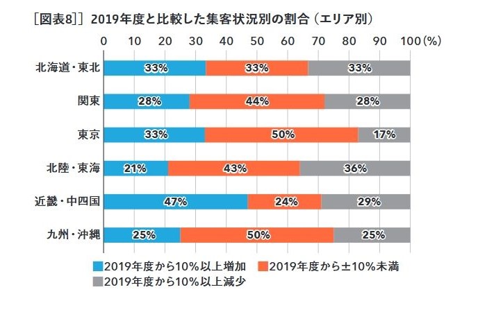 19年度と比較できる87施設をみると、半数以上(45施設)がマイナスだった[図表5]。コロナ前の水準に届かない施設が半数以上を占める一方で、増加している42施設の3分の2にあたる28施設は10%以上の増加を果たしている。