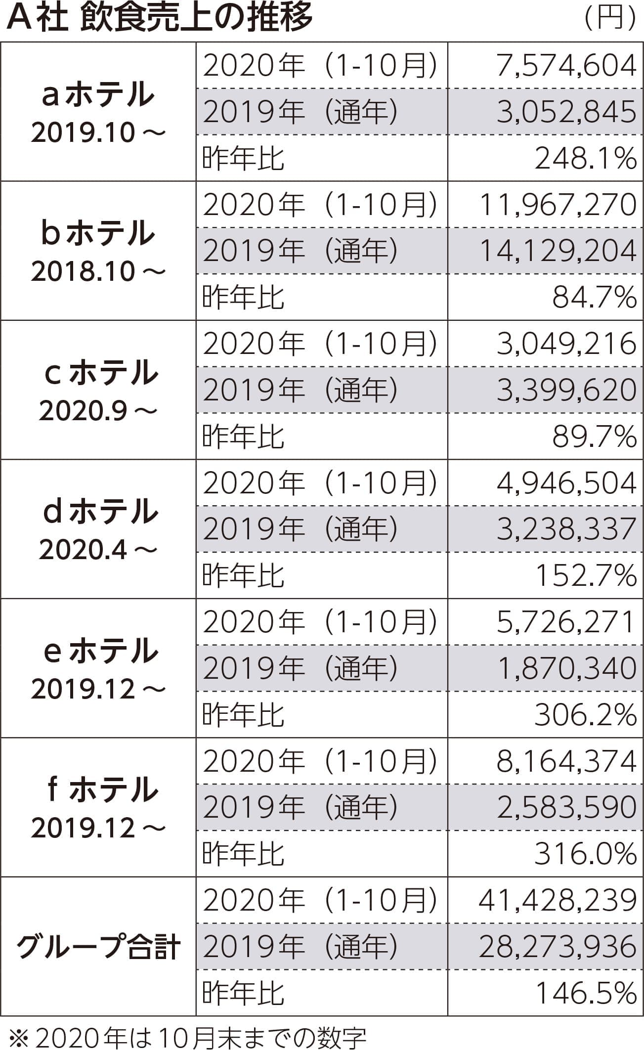 ナコムのコンサルティングを利用するレジャーホテルに6店舗を展開するA社がある。2018年1月にグループで契約を結び、オリジナルメニューを開発し、順次、新メニューを導入していった。コロナ禍で多くのホテルが苦境に立たされるなか、A社の飲食売上は2020年10月までで前年の通年と比べ、すでに47%(1,300万円)の増加となった。繁忙期の11月~12月が順調に推移すれば昨対比はさらに伸びるだろう。
