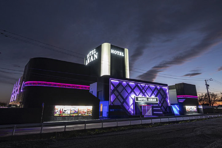 2020年12月15日リニューアルオープンした「HOTEL AMAN」。東名高速道路浜松I.Cから車で5分、1ルーム1ガレージ式の連棟2階建て、地区36年のホテルである。
