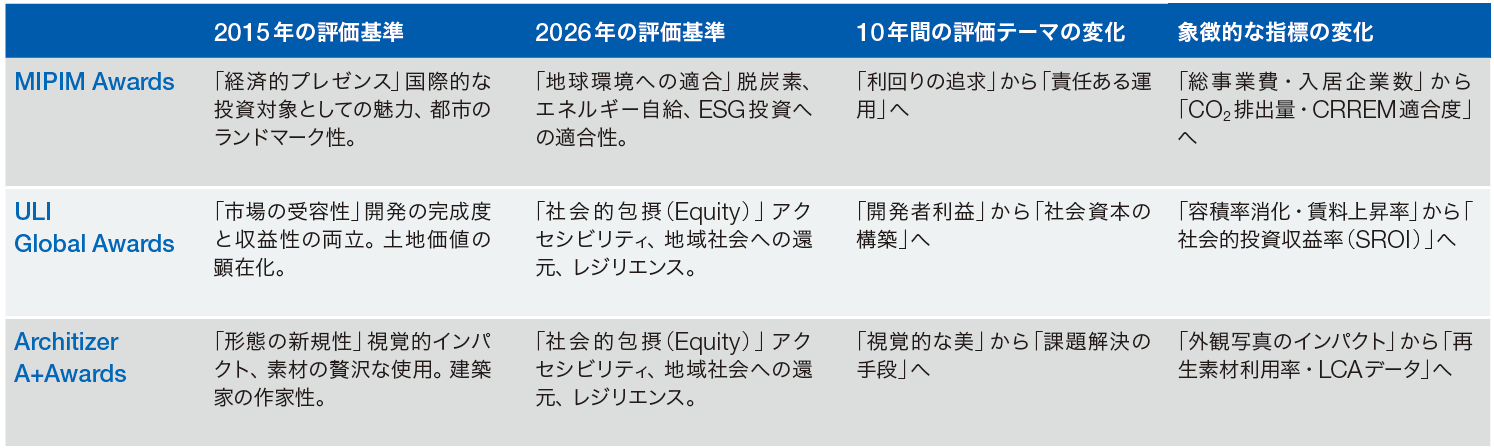 世界を代表する3つの不動産・建築アワードの評価基準が、この10年でどう変化したかを比較分析します。