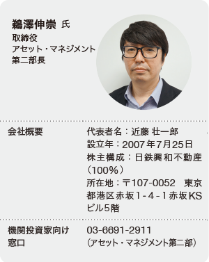 運用する不動産資産は主にグループ内で開発したオフィスビルだが、不動産会社系としてのソーシング力を活かし賃貸住宅や商業施設の運営にも長けている。運用受託はグループ内外を問わない。運用期間5年の一般的なものから、ブリッジやウェアハウジングなど比較的期間の短いものにも対応可能だ。