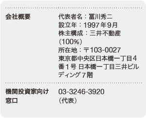 三井不動産グループの開発・運営スキルとネットワークを活かして不動産ファンド事業に取り組み、不動産投資市場のパイオニアとして実績と信頼を積み重ねてきた。現在では2012年3月に運用を開始した三井不動産プライベートリート投資法人を中心に不動産私募ファンドの運用を行っている。不動産投資に関するソリューション・パートナーとしての役割をより高度な次元で果たすことを目標に掲げ、さらなる進化を図っている。
