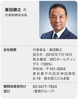 本年3月には、竣工済み物件の中期的受け皿としてコアファンドを組成済みで、今後は上場/私募REITの組成も見据えている。2025年度中には親会社のKICホールディングスの株式上場も計画中だ。業容拡大に伴い「不動産証券化ビジネス分野の人材獲得に力を入れている」と峯田氏。陣容が整い次第、国内では関西や九州エリアへの進出を、海外ではシンガポールにて拠点開設も計画している。