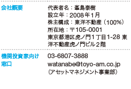 東洋不動産グループの1社。不動産アセットマネジメントとして投資戦略の一翼を担っている。三菱UFJ銀行との取引実績も多く、同行の信用力のもと、東洋不動産やオークラヤ不動産の不動産情報力、東洋不動産プロパティマネジメントのPM機能、東洋ビルメンテナンスの建物総合管理機能をフルに発揮し、総合力でファンド運用のパフォーマンス向上を図っている。