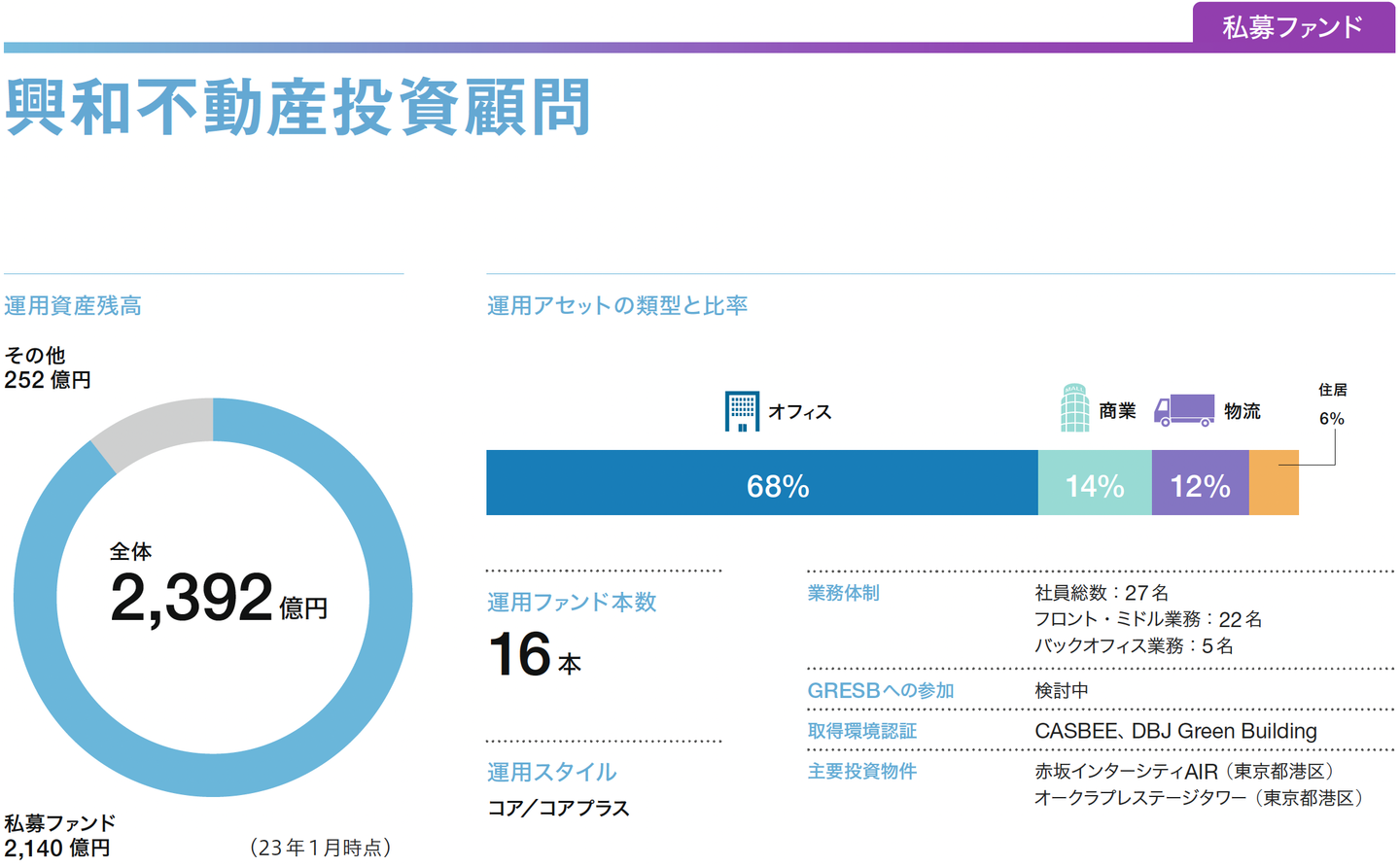 興和不動産投資顧問(KIA)は、日鉄興和不動産傘下のAM会社。運用スタイルはコア型で、運用資産は都心部のオフィスビルが中心。中央金融機関、生損保などグループ親密先約30社を主要顧客に、運用資産残高(AUM)は約2,400億円(2023年1月時点)に及ぶ。
