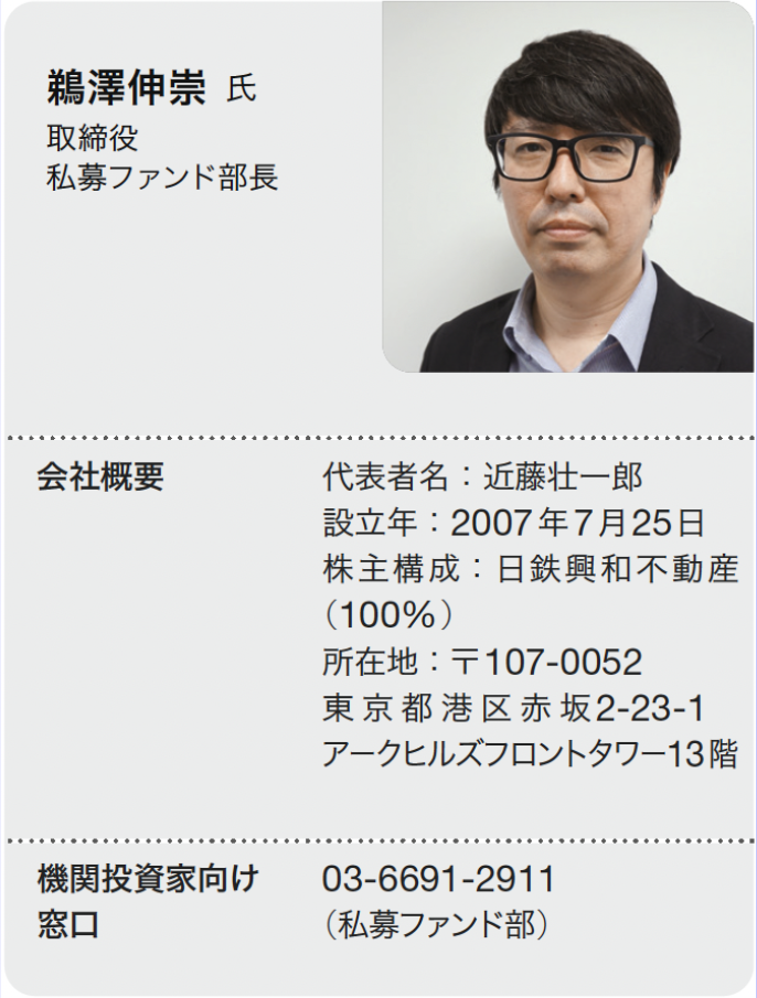 今後のソーシング戦略では、新たなアセットにもフォーカスする。主力の都心部オフィスビルは価格高騰中であり「既存投資家と協議し、コアプラス型へとリスク・リターン目線を調整」(取締役 私募ファンド部長 鵜澤伸崇氏)して物件獲得を継続させる。ひと手間を加えた“コア成り”を目指す戦略だ。「低稼働」物件の再生型ファンドや、再開発を前提とした築古ビルファンド、小規模オフィスビル(基準階面積60~70坪、30億円程度)などのファンドにも挑戦する。