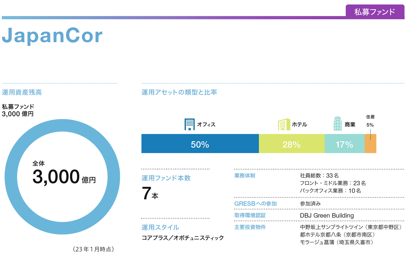 JapanCor(ジャパンコー)は、米ブラックストーンが投資した日本国内の不動産を運用するAM会社。運用資産残高は3,000億円(2023年1月時点)で、運用スタイルはオポチュニスティック型が中心。22年はオフィスや商業施設10物件超を運用するファンドが出口を迎え、「想定通りのキャピタルゲイン確保に貢献した」(CEO 貝塚浩康氏)。ファンドの財務戦略についても、この先の金融環境変化を見据え、大型案件を中心に調達したローンのリファイナンスやリストラクチャリングを支援した。