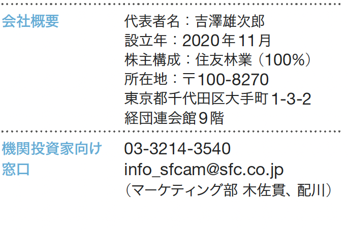 2020年11月に設立、2023年3月時点での運用管理中物件のPJ総コストは約1,600億円。総額約700億円のESG環境配慮型の米国不動産開発ファンドや国内ヘルスケア施設のコアファンドのほか、国内外の集合住宅、物流施設、オフィス、ヘルスケア施設などの開発・コアファンドを組成・管理している。今後は住友林業のブランド力を活かし、森林ファンドや木造に特化したファンドの組成を目指す。