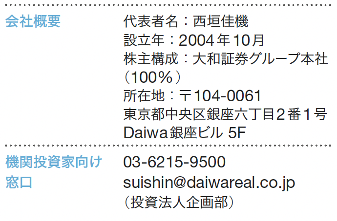 大和証券グループの不動産アセットマネジメント・ビジネスの一翼を担っており、オフィス特化型上場REITの大和証券オフィス投資法人を始めとして、複数のアセットタイプの上場REIT、私募REIT及び各種実物資産を投資対象とした私募ファンドを運用している。大和証券グループのネットワークを活かし、不動産・金融市場の活性化と健全な市場の育成に努め、また安心して長期的に投資・運用できる良質な商品を提供していく。