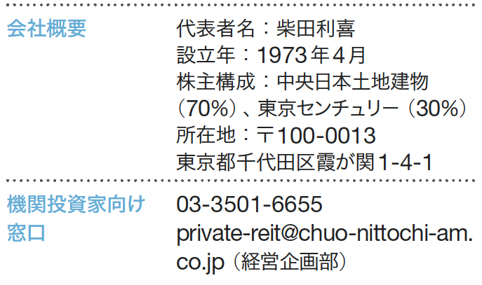 中央日本土地建物グループの資産運用事業を担う中央日土地アセットマネジメント。取扱投資商品は、私募REITと私募ファンド。①デベロッパーであるスポンサールートを通じた物件供給やCRE関連の物件情報力、②多様な投資家との接点、③国内外の金融機関との取引実績、④社外取締役や外部委員も加わったガバナンス態勢、⑤グループ総合力(都市開発、住宅開発、CRE等)を活かした多彩なファンドを企画・運用している。