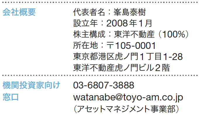 東洋不動産グループの1社。不動産アセットマネジメントとして投資戦略の一翼を担っている。三菱UFJ銀行との取引実績も多く、同行の信用力のもと、東洋不動産やオークラヤ不動産の情報力、東洋不動産プロパティマネジメントのPM及びCM機能、東洋ビルメンテナンスの建物総合管理機能をフルに発揮し、総合力を強みとする。昨今ではインダストリアルアセットへの取組みも強化している。