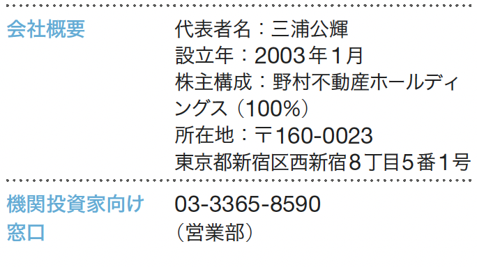 野村不動産グループの一員として不動産に関する高度な専門性を有する強みを生かし、1990年代後半の不動産証券化草創期より、不動産を投資対象とした資産運用事業を本格展開してきた。以来、業界のフロントランナーとして、国内最大級の総合型上場REITをはじめ、私募REIT、私募不動産ファンド及びFoFs(ファンド・オブ・ファンズ)など、多彩な不動産金融商品を投資家に提供している。