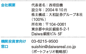 大和証券グループの不動産アセットマネジメント・ビジネスの一翼を担っており、オフィス特化型上場REITの大和証券オフィス投資法人を始めとして、複数のアセットタイプの上場REIT、私募REIT及び各種実物資産を投資対象とした私募ファンドを運用している。大和証券グループのネットワークを活かし、不動産・金融市場の活性化と健全な市場の育成に努め、また安心して長期的に投資・運用できる良質な商品を提供していく。